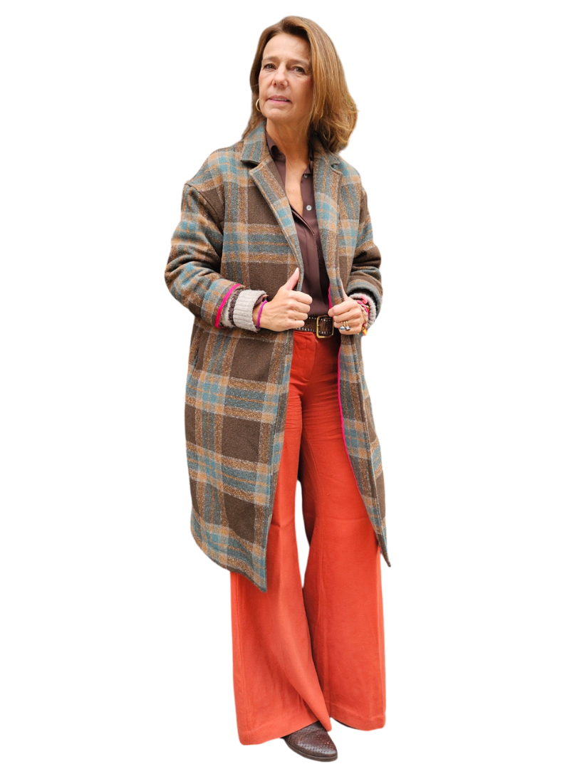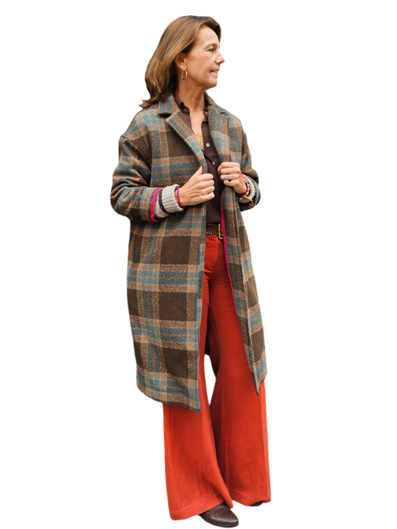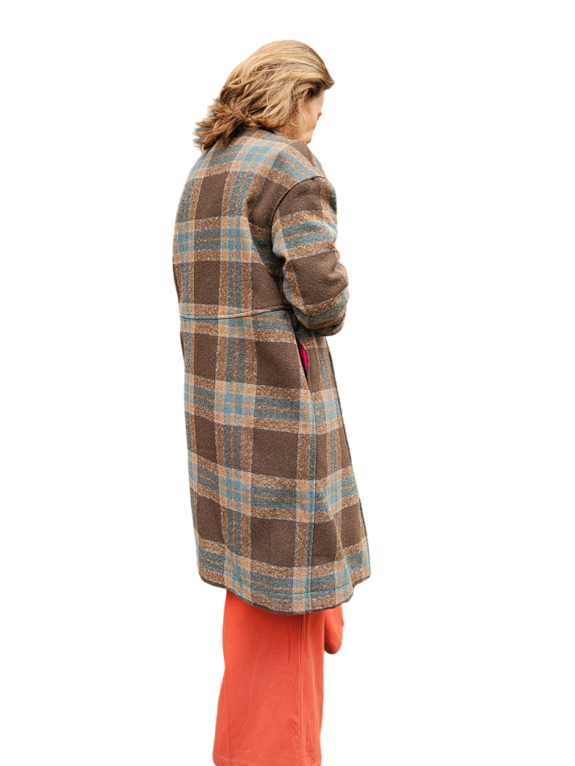 Abrigo oversize con dos bolsillos, Sin forro y sin botones. La parte interior es muy agradable. Disponible en cuadros Berenjena y cuadros Blanco.