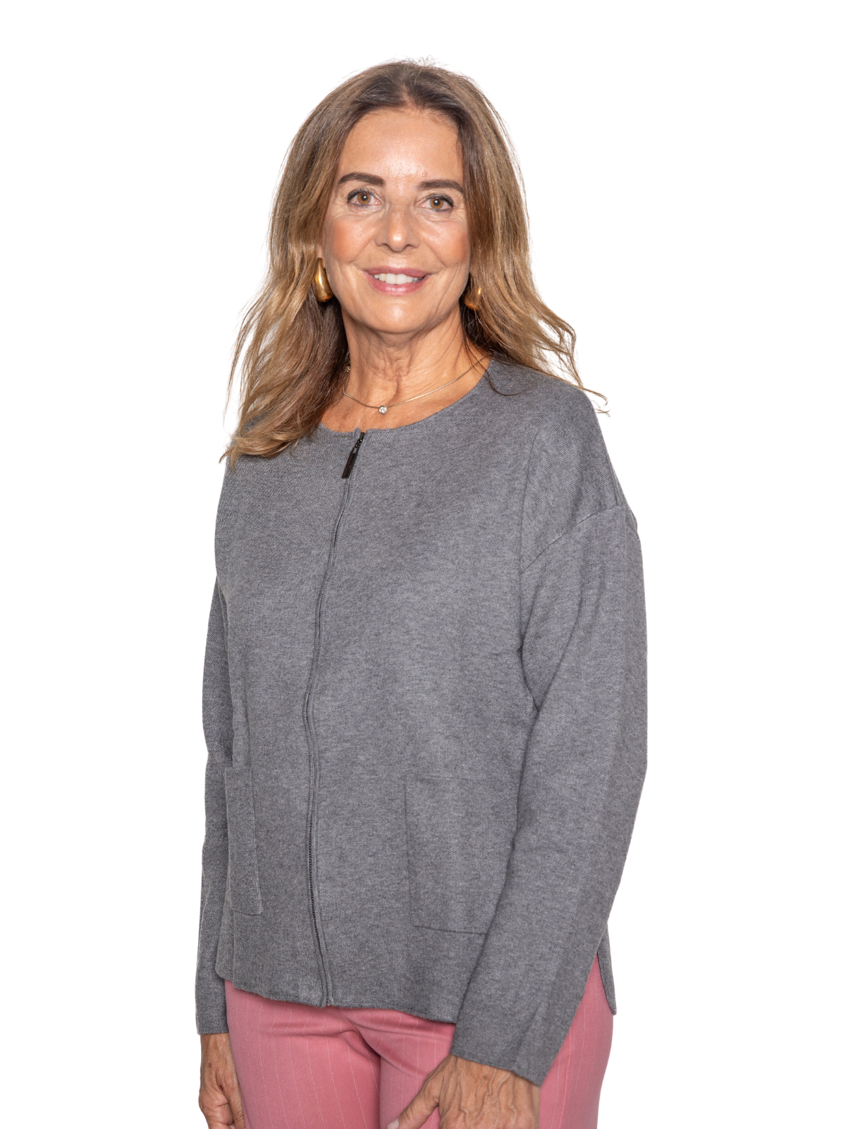 Cárdigan recto con dos bolsillos, cierre con cremallera y aberturas laterales.